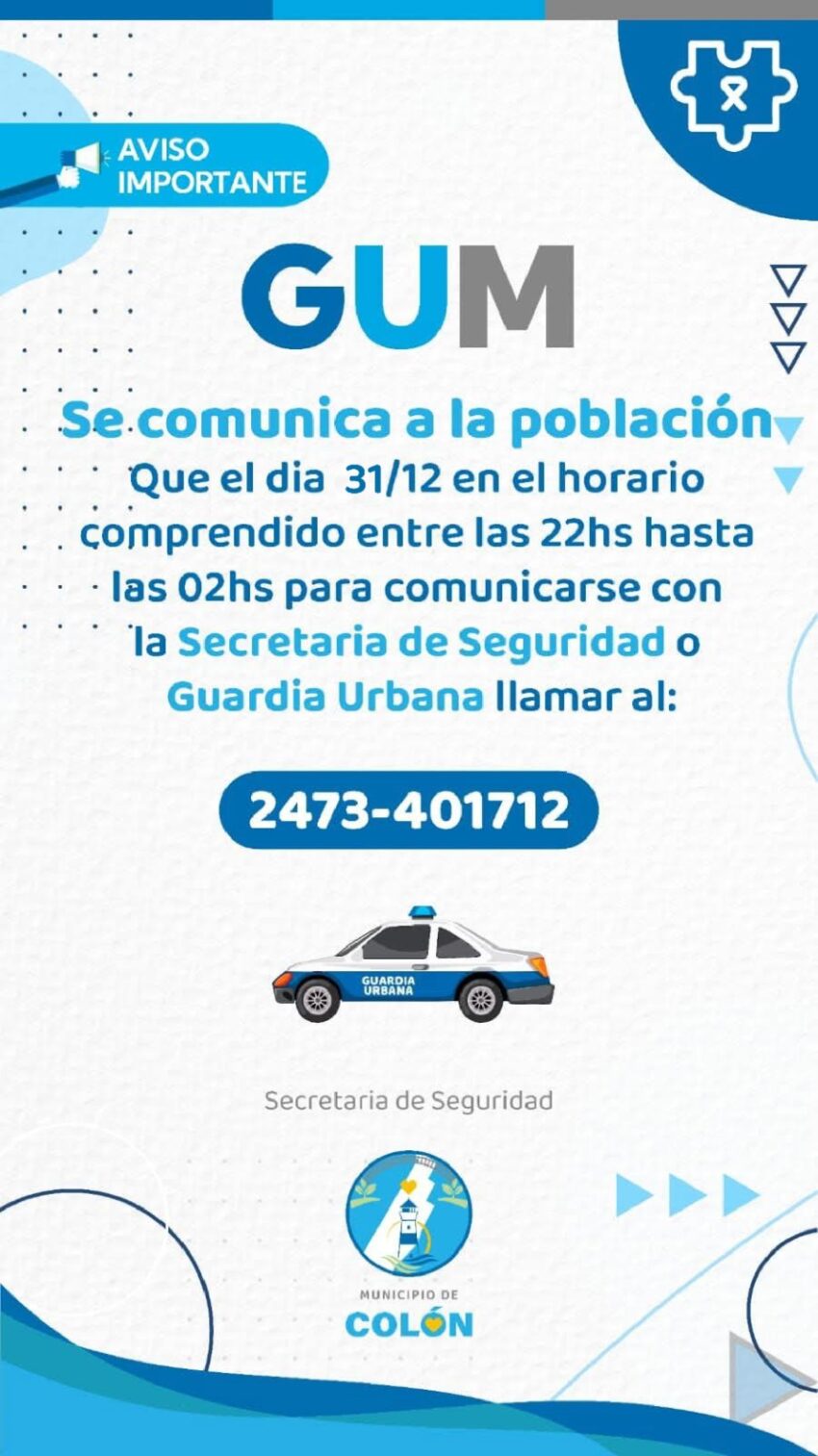 GUM Posted on 30 diciembre, 2025 by emisora Se comunica a la población que el dia 31/12 en el horario comprendido entre las 22h hasta las 02h para comunicarse con la secretaría de Seguridad o guardia urbana, pueden llamar al 2473-401712