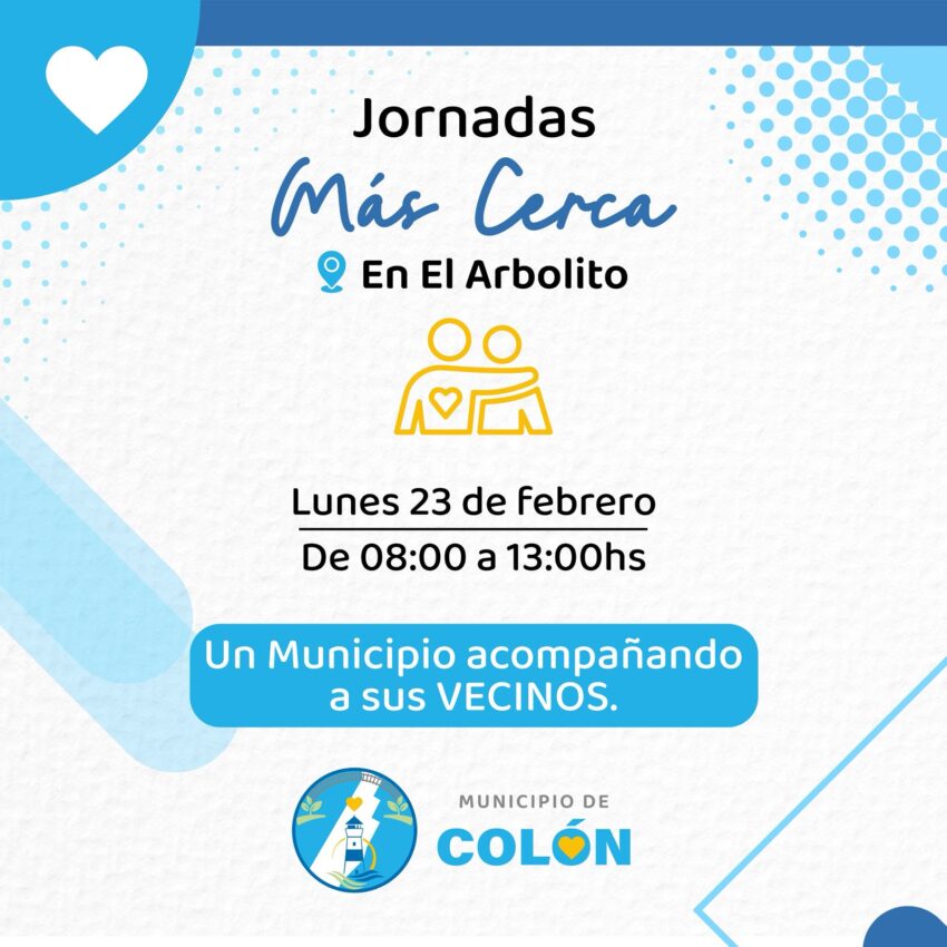 La Municipalidad de Colón informó que se pone en marcha una nueva jornada del programa “Más Cerca”, en éste caso en El Arbolito. El próximo lunes 23 de febrero de 8:00 a 13:00.
