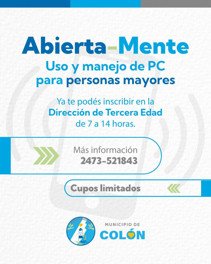 El Municipio de Colón invita a participar de “Abierta-Mente”, un espacio especialmente pensado para que personas mayores aprendan a utilizar la computadora de forma sencilla, práctica y con acompañamiento. La propuesta busca brindar herramientas para mejorar la comunicación, el acceso a la información y la autonomía digital.